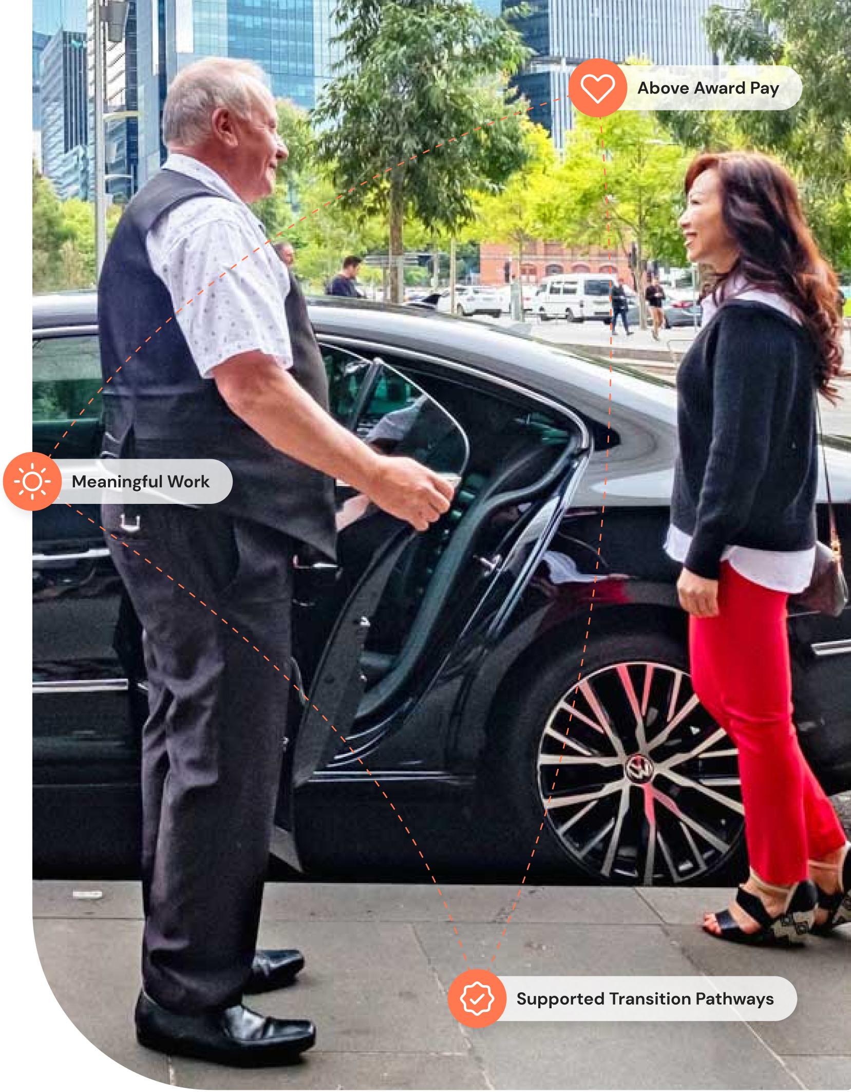 Our Police checked and Working with Children checked Chauffeurs, give you old school door to car service. Your transport need, enables us to give them meaningful employment with a genuine purpose.